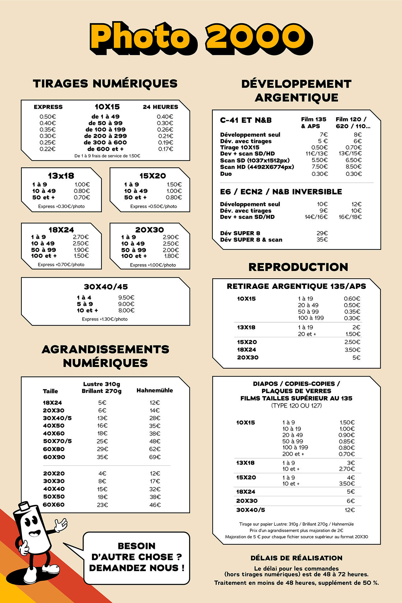 Tous les tarifs du magasin et les tarifs pour les commandes en ligne.